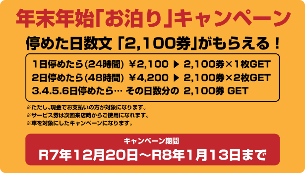 2,100円 ※平面駐車場では、上限料金が適用されません。 ※入庫後24時間繰り返し。 |